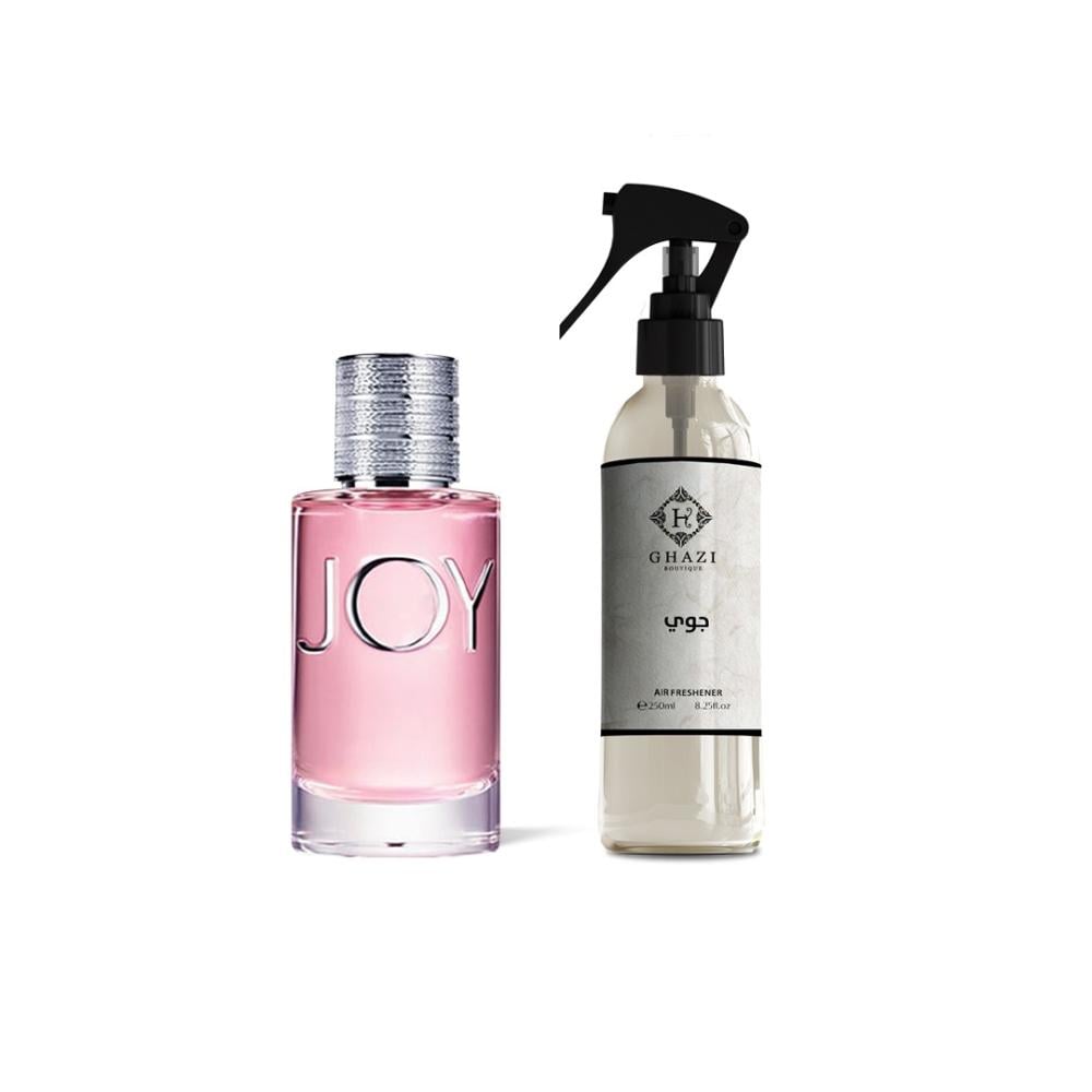 معطر الجو جوي – غازي بوتيكمستوحى من عطر Joy. رذاذ مفارش زهورية منعشة ممزوجة بلمسات فخمة، ينشر البهجة في كل زاوية. ثابت وطويل الأمد، ريحته تعلّق بالسجاد والستائر وتخلي الجو مليان طاقة إيجابية.